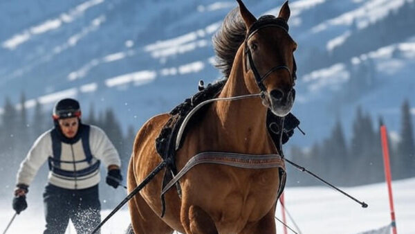 Imagine um cavalo galopando a toda velocidade por uma pista nevada, guiado por um cavaleiro, enquanto um esquiador, preso a uma corda, desvia...